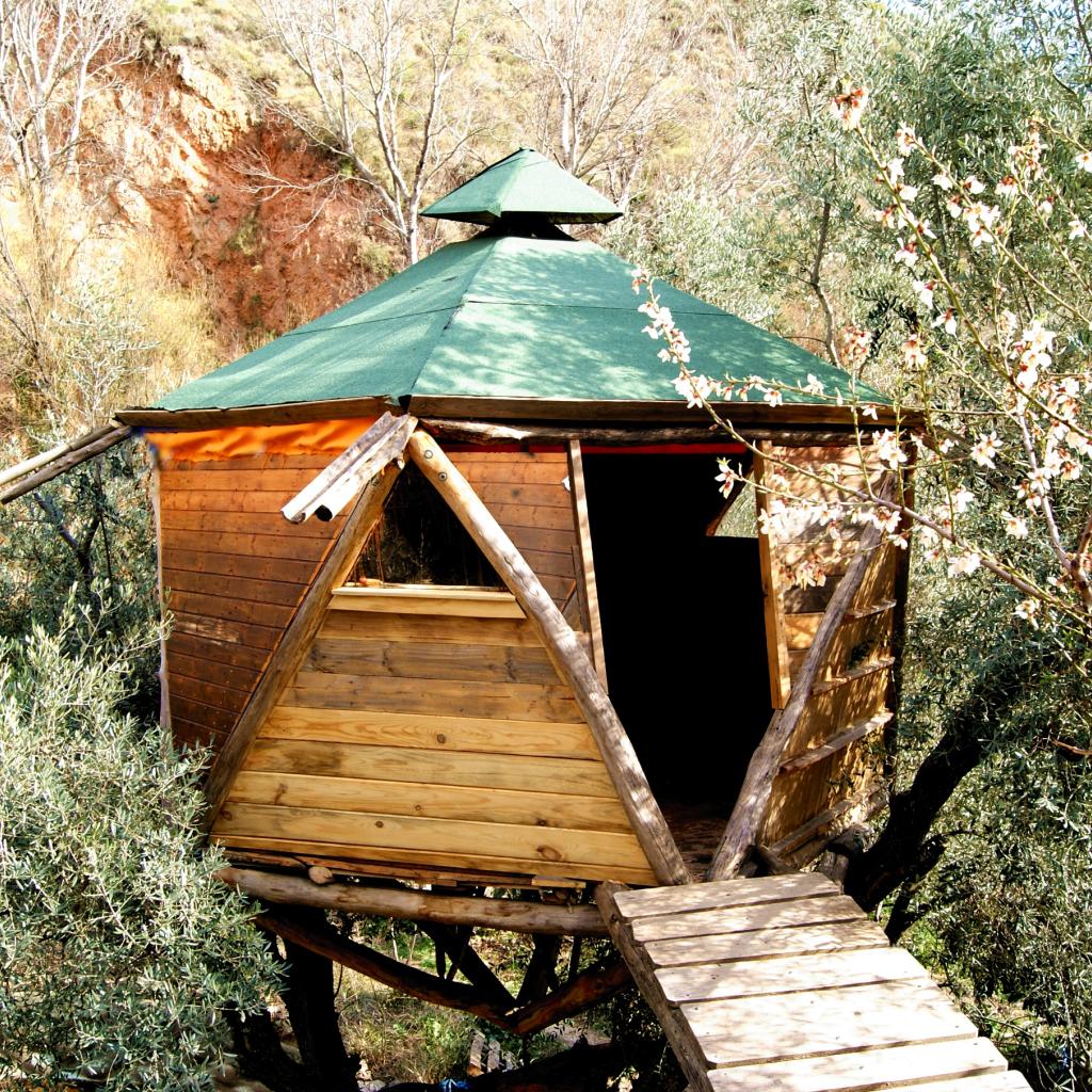 The Icosaeder, nestled amidst the olive branches above our pool, unfolds its five triangular sidewalls to transform into a pentagonal sanctuary. Here, you can relish the cool Sierra Nevada breeze while enjoying the dappled shade provided by this innovative and natural retreat.